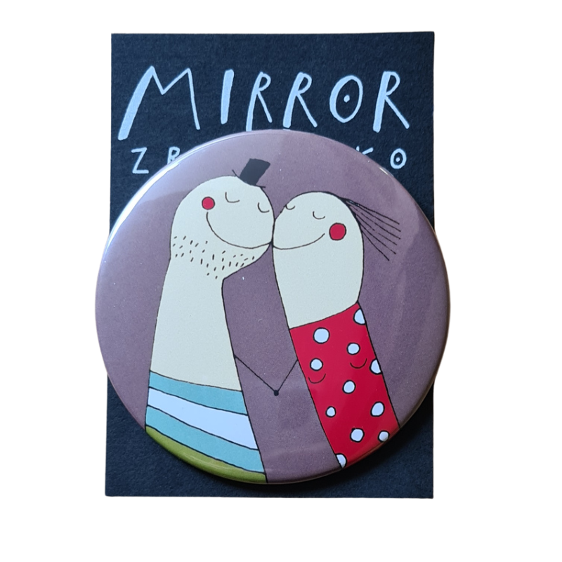 Roztomilé kapesní zrcátko s ilustrací páru, který si dává něžný polibek. Hravý motiv působí mile, trochu poeticky a připomíná, že i malé věci mohou vykouzlit úsměv.