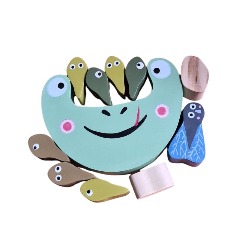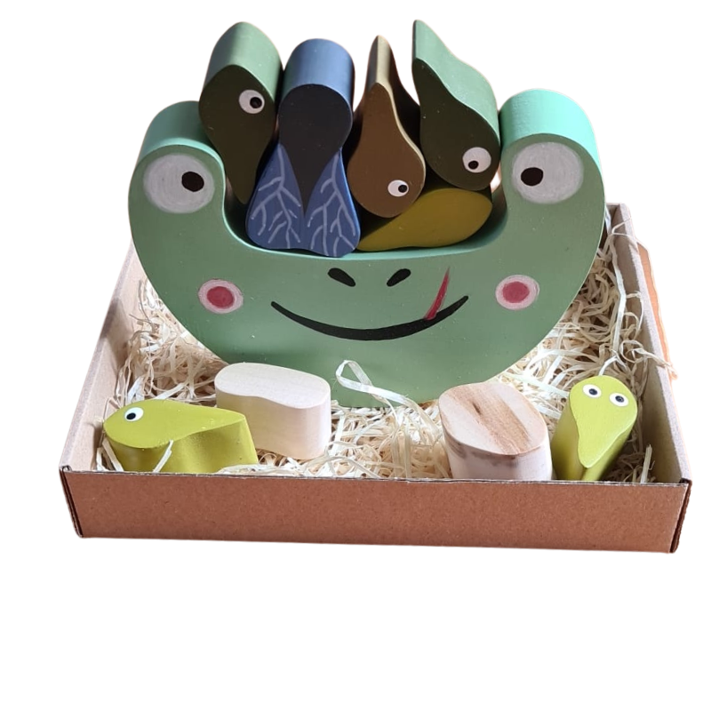 Sada obsahuje několik dřevěných dílků ve tvaru pulců a dalších tvarů, které je možné různě kombinovat a vyvažovat na základně ve tvaru žáby. Hra tak rozvíjí jemnou motoriku, logické uvažování i strategické přemýšlení.