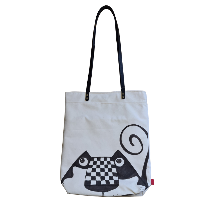 Stylová plátěná taška, která spojuje jednoduchost s hravým designem. Na první pohled čistý, světlý základ doplňuje výrazný černobílý motiv s jemně surrealistickým nádechem – ideální pro všechny, kdo chtějí něco trochu jiného než obyčejnou plátěnou tašku.